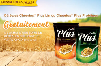 Céréales Cheerios Plus Lin ou Cheerios Protein Plus gratuitement à l’achat d’une boîte de céréales Cheerios de votre choix (345g – 500g).