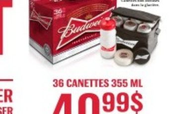Lorsque vous achetez une caisse de 36 canettes Budweiser chez Couche-Tard, obtenez gratuitement un ensemble de hockey comprenant un sac glacière, une rondelle de hockey, une gourde et un ruban adhésif de sport.