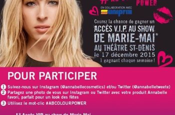 Pour participer, ils suivre sur Instagram au @annabellecosmetics et/ou Twitter au @annabelletweete, prendre une photo de vous-mêmes (« selfie ») avec votre produit Annabelle préféré pour un look parfait des fêtes et l’afficher sur votre compte Instagram ou Twitter avec #ABCOLOURPOWER.