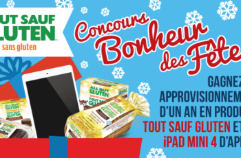 Gagnez un approvisionnement d’un (1) an en produits Tout Sauf Gluten (311,48 $) et un (1) iPad mini 4 avec finition argentée, capacité de 16 Go et technologie Wi-Fi (439,00 $).