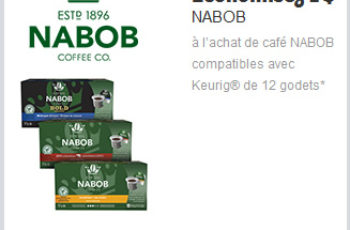 Achetez 1 et Économisez 1 $ à l’achat de café NABOB compatibles avec Keurig® de 12 godets avec ce coupon rabais Websaver.