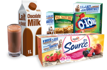 QUÉBEC : 1 L DE LAIT AU CHOCOLAT GRATUIT à l’achat d’un emballage spécialement identifié de yogourt Yoplait Source ou de deux boîtes spécialement identifiées de collations pour enfants Betty Crocker au choix.