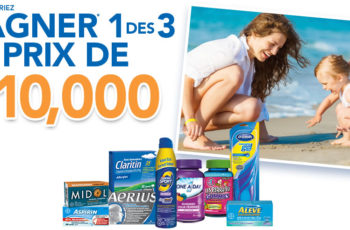 Produits Participants: Tous les produits Aerius®, Aleve®, ASPIRIN®, Claritin®, Coppertone®, Dr. Scholl’s®, Les Pierrafeu, Midol® et One A Day®.