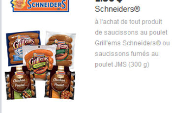 Économisez 1.50 $ à l’achat de tout produit de saucissons au poulet Grill’ems Schneiders® ou saucissons fumés au poulet JMS (300 g).
