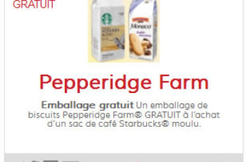 Un emballage de biscuits Pepperidge Farm® GRATUIT à l’achat d’un sac de café Starbucks® moulu.
