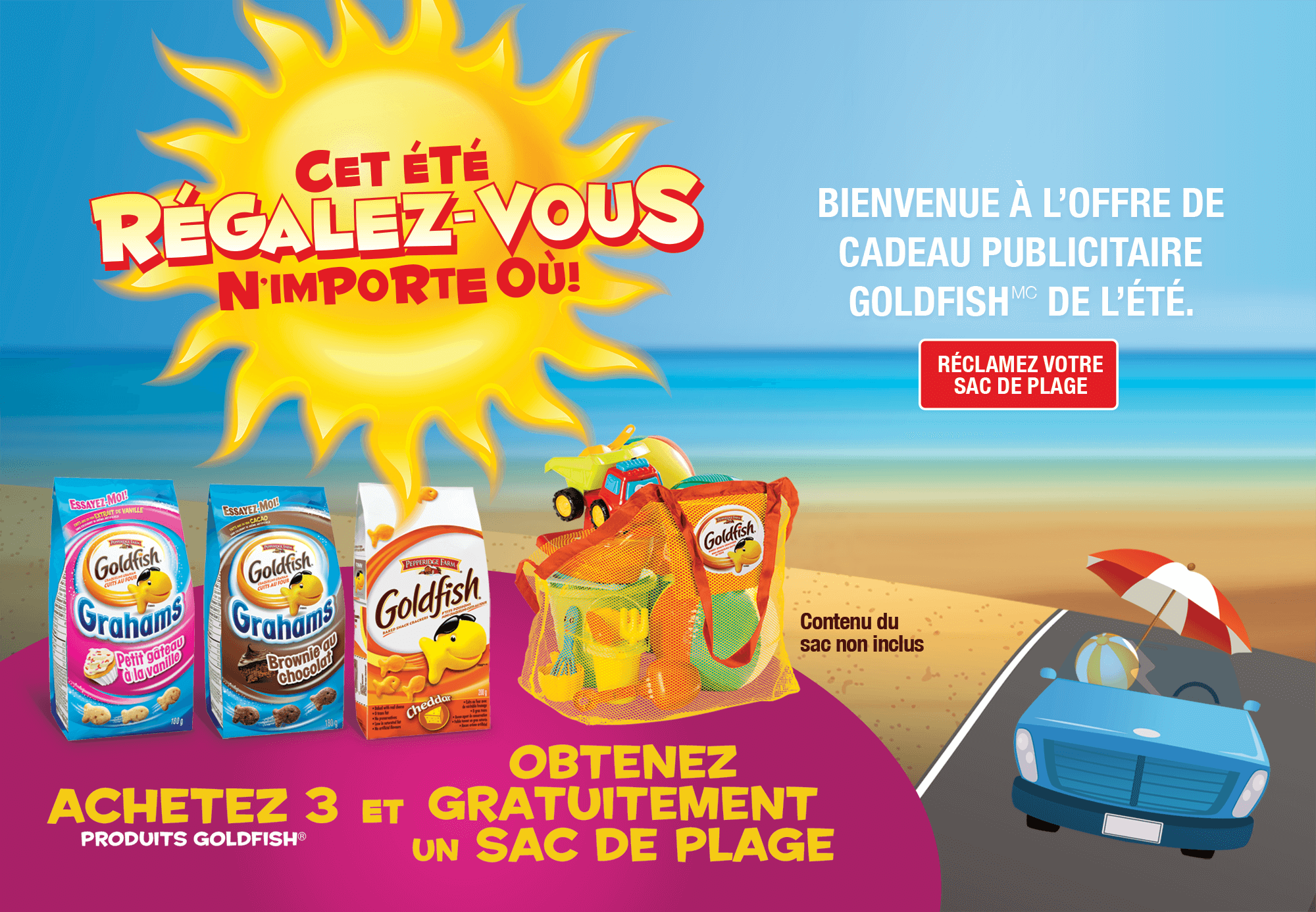 À l’achat de trois (3) emballages des produits Pepperidge Farm® Goldfish® admissibles (entre 156 g et 1,36 kg) en une seule transaction entre le 16 mai 2016 et le 15 juillet 2016 inclusivement, vous recevrez un grand sac de plage en filet réutilisable d’une valeur approximative de 6,50$.