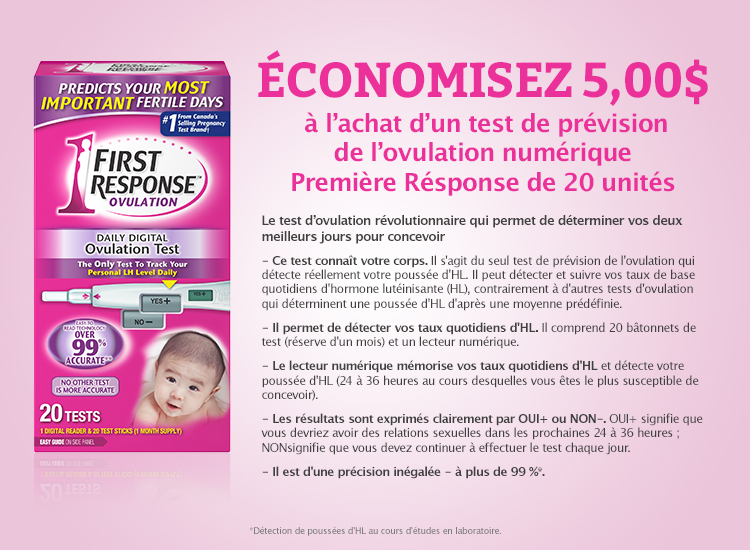 Économisez 5,00$ à l’achat d’un test de prévision de l’ovulation numérique Coupon Première Résponse de 20 unités avec ce coupon à imprimer sur Save.ca.