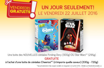 Une boîte des NOUVELLES céréales Finding Dory (300g) OU Star Wars (295g) GRATUITE à l’achat d’une boîte de céréales Cheerios (variété au choix) (330g-720g).
