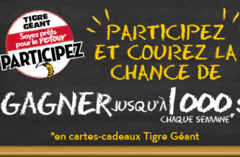 Courez la chance de gagner jusqu’à 1 000 $ en cartes-cadeaux Tigre Géant chaque semaine. De plus, si vos amis s’inscrivent aussi au concours, vous augmentez vos chances de gagner!