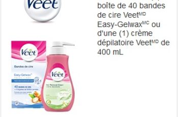 - Économisez 3 $ à l’achat d’une (1) boîte de 40 bandes de cire Veet Easy-Gelwax ou d’une (1) crème dépilatoire Veet de 400 mL
