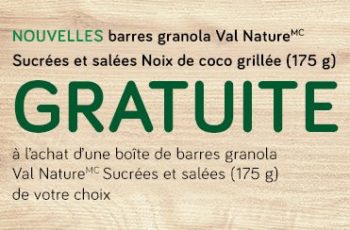 Obtenez une boîte de barres granola Val Nature Sucrées et Salées Noix de coco grillée (175 g) GRATUITES à l’achat d’une boîte de barres Val Nature sucrées et salées de votre choix avec ce coupon à imprimer sur Walmart.ca.