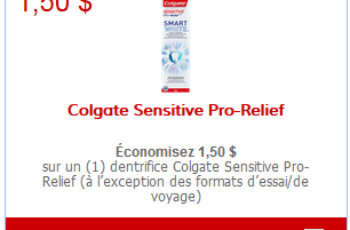 - Économisez 1,50$ sur un dentifrice Colgate Sensitive Pro-Relief (à l’exception des formats d’essai/de voyage).