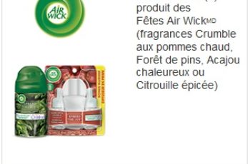 Économisez 2 $ à l’achat d’un (1) produit des Fêtes Air Wick (fragrances Crumble aux pommes chaud, Forêt de pins, Acajou chaleureux ou Citrouille épicée).