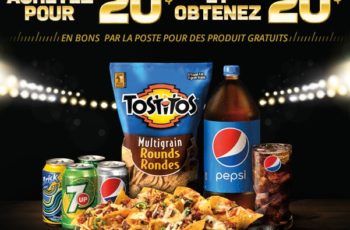 Achetez des produits PepsiCo participants pour un montant total de 20$ et obtenez 20$ en bons par la poste pour des produits gratuits Pepsi.
