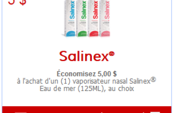 Économisez 5,00 $ à l’achat d’un (1) vaporisateur nasal Salinex Eau de mer (125ML), au choix.