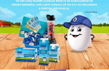 Participez maintenant et courez la chance de gagner UN DES CINQ PANIERS CADEAUX REMPLIS DE MARCHANDISE DE FERMES BURNBRAE, UNE CARTE CADEAUX DE 100 $ ET UN MÉLANGEUR À PORTION INDVIDUELLE.