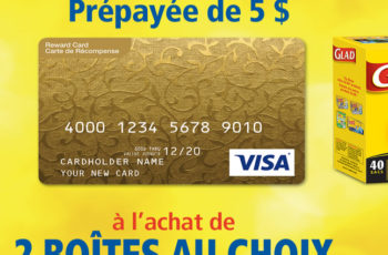 Achetez 2 boîtes des sacs GLAD® participants pour avoir droit à votre carte Visa® virtuelle prépayée de 5$. N’oubliez pas que tous les produits admissibles doivent figurer sur le même reçu.