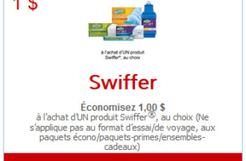 Économisez 1,00 $ à l’achat d’UN produit Swiffer®, au choix (Ne s’applique pas au format d’essai/de voyage, aux paquets écono/paquets-primes/ensembles-cadeaux) avec ce nouveau coupon rabais à imprimer sur SmartSource.ca.