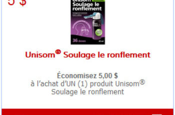 Économisez 5,00 $ à l’achat d’UN (1) produit Unisom® Soulage le ronflement avec ce nouveau coupon rabais à imprimer sur Smartsource.ca.