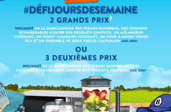 Il y a deux (2) grands prix à gagner, comprenant de la marchandise des Fermes Burnbrae (VAD : 100 $), des coupons échangeables contre des produits gratuits (VAD : 75 $), un (1) ultra mélangeur vélocité 1 HP, SPB-650C, argent et noir (VAD : 99 $), un (1) mini robot culinaire CUISINART DLC-2ABC chrome et nickel brossé de 3 tasses (VAD : 65 $), un (1) four à micro-ondes RCA 0,7 pied cube en acier inoxydable (VAD : 90 $), un ensemble de poêles Calphalon de 8 et 10 po (VAD : 80 $). VAD total du grand prix : 500 $.