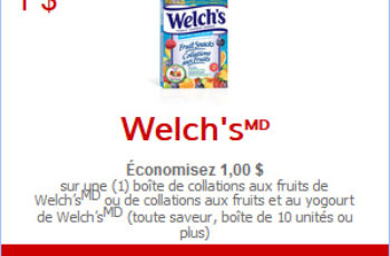 Économisez 1,00 $ sur une (1) boîte de collations aux fruits de Welch’s ou de collations aux fruits et au yogourt de Welch’s (toute saveur, boîte de 10 unités ou plus) avec ce coupon rabais à imprimer sur le site SmartSource.ca.