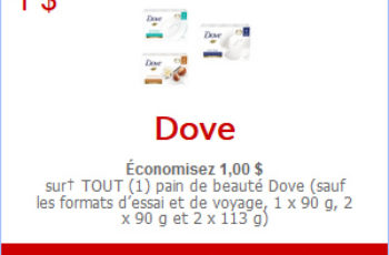 Économisez 1,00 $ sur TOUT (1) pain de beauté Dove (sauf les formats d’essai et de voyage, 1 x 90 g, 2 x 90 g et 2 x 113 g) avec ce coupon rabais que vous pouvez imprimer sur Smartsource / UtiliSource.