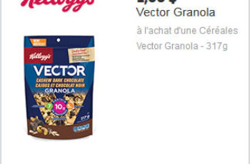 Économisez 1 $ à l’achat d’une Céréales Vector Granola – 317g avec ce coupon rabais à imprimer sur Websaver.ca.