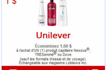 Économisez 1.00 $ à l’achat d’UN (1) produit capillaire Nexxus®, TRESemmé® ou Dove (sauf les formats d’essai et de voyage). Échangeable aux magasins Loblaws Inc.