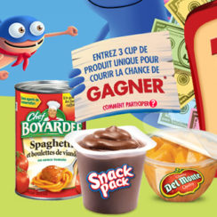 Snack Pack, Chef Boyardee et Del Monte aimeraient vous donner jusqu’à 10 000 $ en argent! Il suffit d’acheter des coupes de pouding Snack Pack, des pâtes en conserve Chef Boyardee ou des fruits à emporter Del Monte et d’entrer le ou les CUP à boucheesdeplaisir.ca …