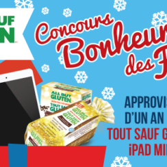 Gagnez un approvisionnement d’un (1) an en produits Tout Sauf Gluten (311,48 $) et un (1) iPad mini 4 avec finition argentée, capacité de 16 Go et technologie Wi-Fi (439,00 $). Le concours se termine le 31 janvier 2016. Cliquez ici >>