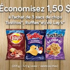 Économisez 1,50 $ à l’achat de 3 sacs de chips Tostitos, Lay’s et/ou Ruffles (205 g – 320 g, saveur / variété au choix ) avec ce coupon rabais à imprimer sur Walmart.ca Cliquez ici >>