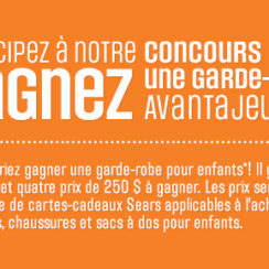 Vous pourriez gagner une garde-robe pour enfants! Il y a un prix de 500 $ et quatre prix de 250 $ à gagner. Les prix seront remis sous forme de cartes-cadeaux Sears applicables à l’achat de vêtements, chaussures et sacs à dos pour enfants. Le concours …