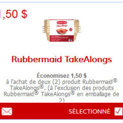 Économisez 1,50 $ à l’achat de deux (2) produit Rubbermaid® TakeAlongs®. (à l’exclusion des produits Rubbermaid® TakeAlongs® en emballage de 2) avec ce coupon rabais à imprimer avec UtiliSource.ca Limite de 2 impressions par ordinateur. Cliquez ici >>