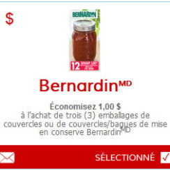 Économisez 1,00 $ à l’achat de trois (3) emballages de couvercles ou de couvercles/bagues de mise en conserve Bernardin avec ce coupon rabais à imprimer sur UtiliSource.ca. Limite de deux impressions par ordinateur. Cliquez ici >>