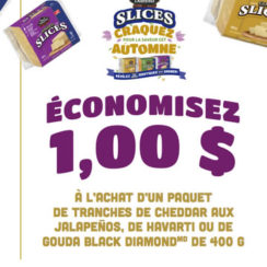 Économisez 1,00$ à l’achat d’un paquet de tranches de cheddar aux jalapenos, de havarti ou de gouda Black Diamond de 400 G. Date d’expiration: 31 mars 2019 Cliquez ici >>