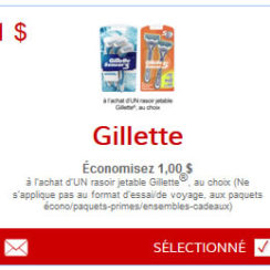 Économisez 1,00 $ à l’achat d’UN rasoir jetable Gillette®, au choix (Ne s’applique pas au format d’essai/de voyage, aux paquets écono/paquets-primes/ensembles-cadeaux). Limite de deux impressions par ordinateur. Cliquez ici >>