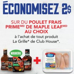 Économisez 2,00 $ sur du Poulet Frais Prime de Maple Leaf au choix à l’achat de tout produit La Grille de Club House avec ce nouveau coupon rabais à imprimer sur Save.ca. Date D’expiration 2016-08-31 Cliquez ici >>