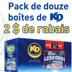 Économisez 0,75 $ sur une (1) boîte de 4 KD Original. KraftCanada.com – Les quantités de coupons sont limitées et ils sont offerts sur une base de premier arrivé, premier servi. Limite d’un (1) coupon imprimé par offre, par membre. Cliquez ici >>