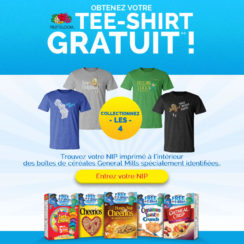 Procurez-vous une boîte spécialement identifiée de céréales General Mills indiquant l’offre d’un tee-shirt gratuit. Recherchez le NIP imprimé à l’intérieur de chaque boîte et entrez votre NIP pour recevoir votre tee-shirt gratuit par la poste. Jusqu’à 330 000 tee-shirts sont offerts. Offre valable jusqu’à épuisement des …