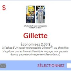 Économisez 1,00 $ à l’achat d’UN produit de prérasage OU d’UN produit Hydragel Gillette®, au choix (Ne s’applique pas au format d’essai/de voyage, aux paquets écono/ paquets-primes/ensembles-cadeaux). Économisez 2,00 $ à l’achat d’UN rasoir rechargeable Gillette®, au choix (Ne s’applique pas au format d’essai/de voyage, aux …