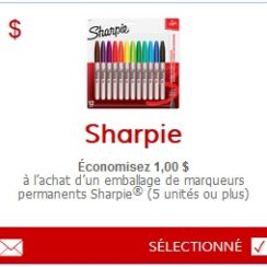 Économisez 1,00 $ à l’achat d’un emballage de marqueurs permanents Sharpie® (5 unités ou plus) avec ce nouveau coupon rabais à imprimer sur le portail Smartsource. Deux impressions par ordinateur. Cliquez ici >>