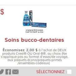 Économisez 2,00 $ à l’achat de DEUX produits Crest® OU Oral-B®, au choix (Ne s’applique pas au format d’essai/de voyage, aux paquets écono/paquets-primes/ensembles-cadeaux). Limite de deux impressions par ordinateur. Cliquez ici >>