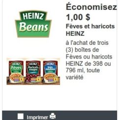 Économisez 1,00 $ à l’achat de trois (3) boîtes de Fèves ou haricots HEINZ de 398 ou 796 ml, toute variété KraftCanada.com – Les quantités de coupons sont limitées et ils sont offerts sur une base de premier arrivé, premier servi. Limite d’un (1) coupon imprimé …