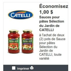 Économisez 1,00 $ à l’achat de deux (2) pots de Sauce pour pâtes Sélection du Jardin de CATELLI, toute variété. KraftCanada.com – Les quantités de coupons sont limitées et ils sont offerts sur une base de premier arrivé, premier servi. Limite d’un (1) coupon imprimé par …
