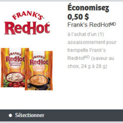 Économisez 50 ¢ à l’achat d’un (1) assaisonnement pour trempette Frank’s RedHot (saveur au choix, 24 g à 28 g) Économisez 1 $ à l’achat d’une (1) bouteille d’assaisonnement Frank’s RedHot (saveur au choix, 132 g à 153 g) Cliquez ici >>